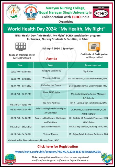 World Health Day 2024 April 6, 2024April 6, 2024 Observance on “World Health Day” on 8th April, 2024 organised by the Department of Nursing Foundation, Narayan Nursing College in collaboration with ECHO India.